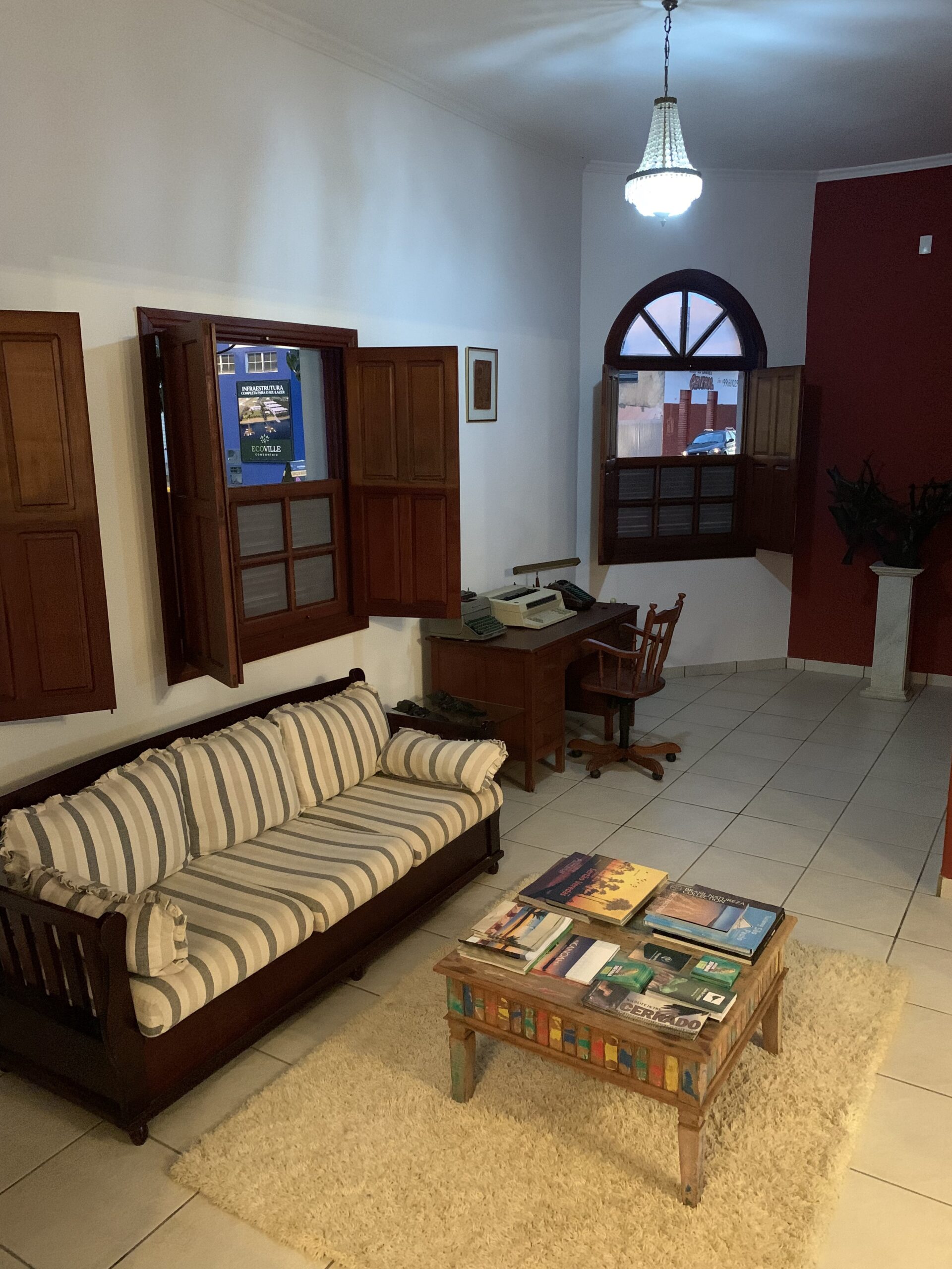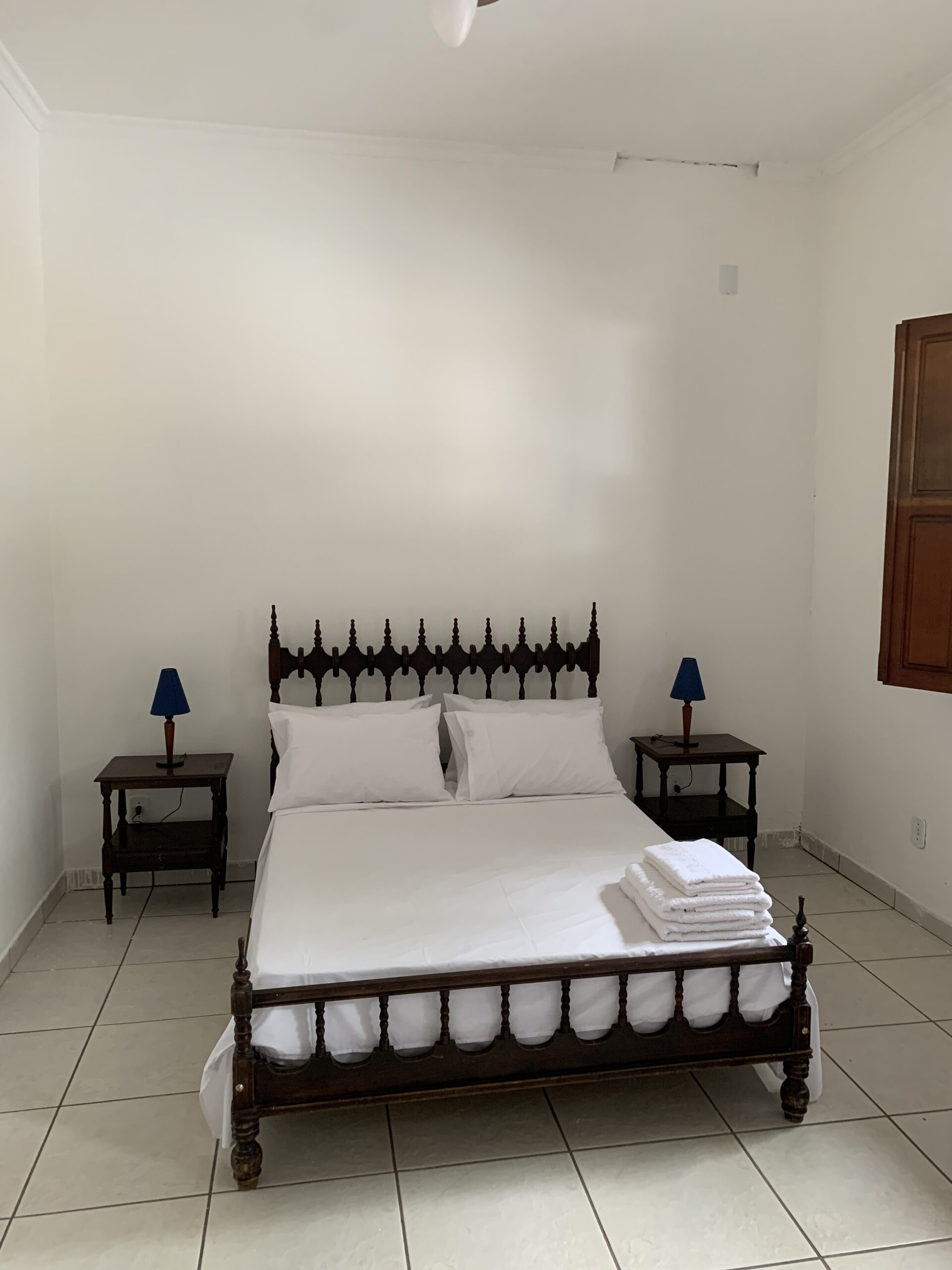 Suíte com quarto conjugado, capacidade para até cinco pessoas, porta com acesso para a varanda externa, janelas amplas com vista para praça central, porta central com acesso ao hall da casa